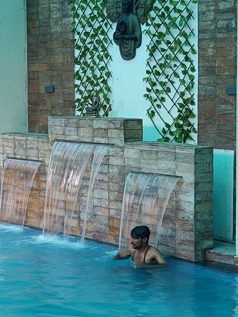 The fascinating, open air swimming pool is located near a tremendous ocean with its beautiful view. Swimming pool is construct with the cool blue tiles that enhance the color of water in the pool. Day is not so hot due to slight breeze that touching the people faces softly.