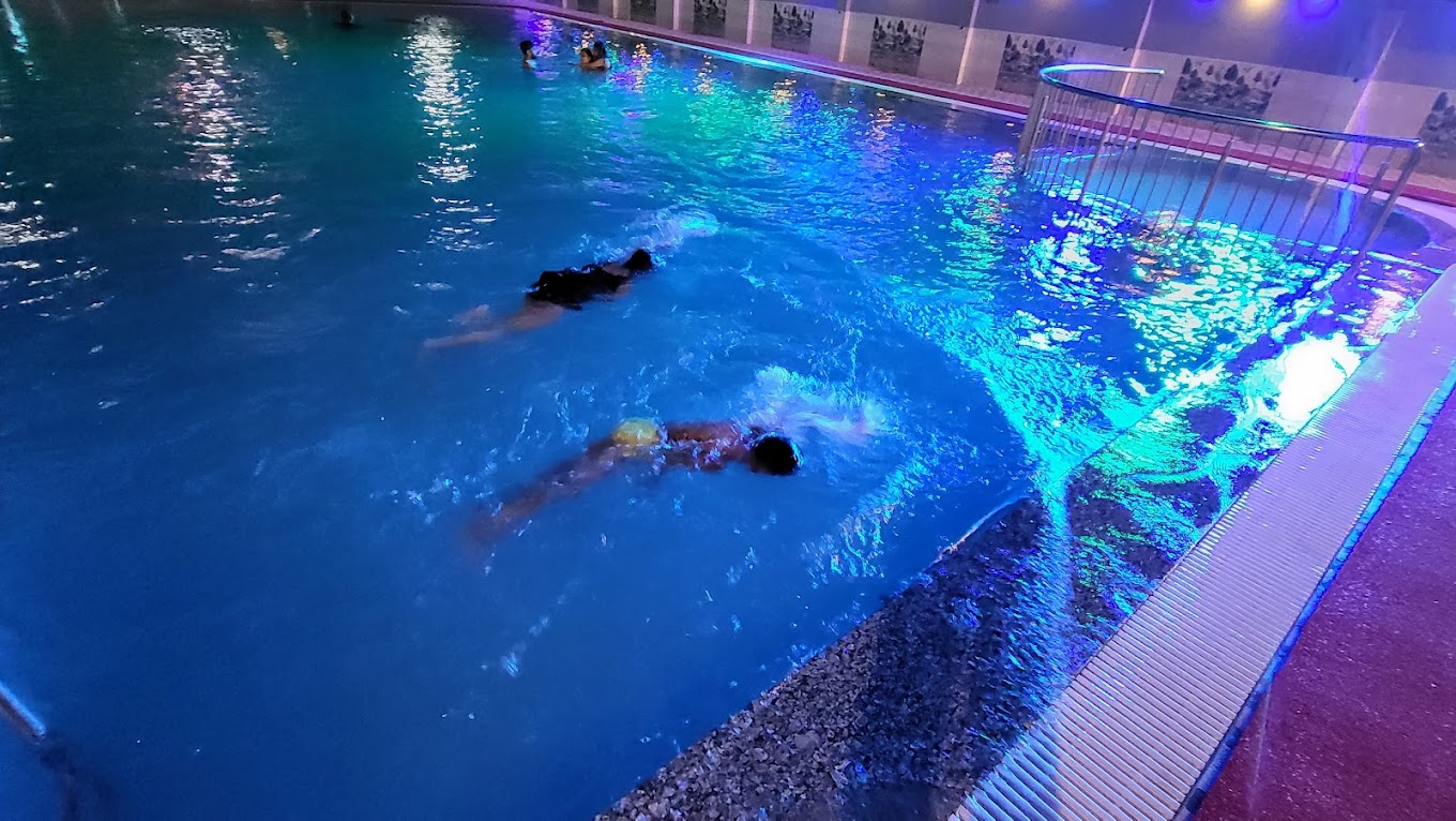 Swimming pool is construct with the cool blue tiles that enhance the color of water in the pool. Day is not so hot due to slight breeze that touching the people faces softly. Water in the pool is blue as the sky and clean as the crystal. Cool blue Water of pool is soothing the eyes and refreshing mind and body.